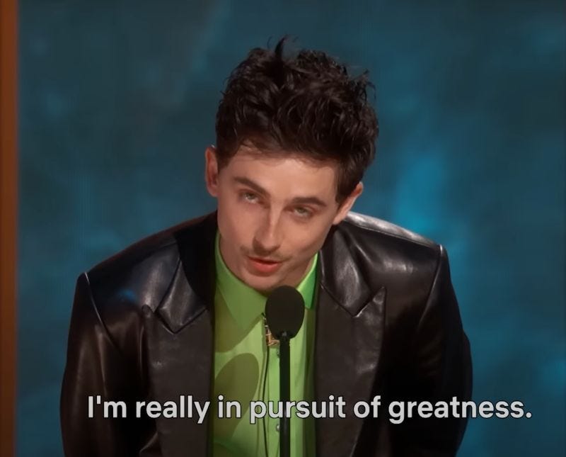 One week before my fateful train ride through the snow, I was at the cinema watching Marty Supreme. The film is a masterclass in delusion. No doubts. No backup plans. Just dogged determination, delusion and a dream. Marty Mauser goes through hell and back to make it to the ping pong world championships. It’s a dream that seems insignificant to many of the people in his life who don’t see ping pong as a serious sport, but nothing deters his pursuit. The release of Marty Supreme, its hyperactive marketing campaign and Timothée Chalamet’s SAG Award speech on “the pursuit of greatness” all point to a wider trend that encourages delusional dreaming.
